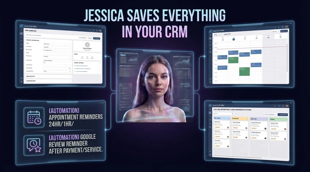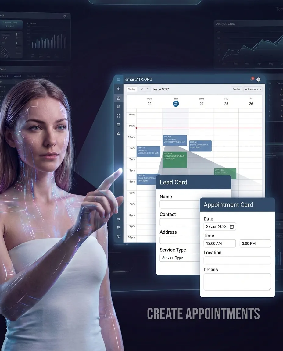 Jessica checks your real-time availability and books the estimate or service call directly into your calendar. Also creates a Lead and Appointment Card with all the Information.